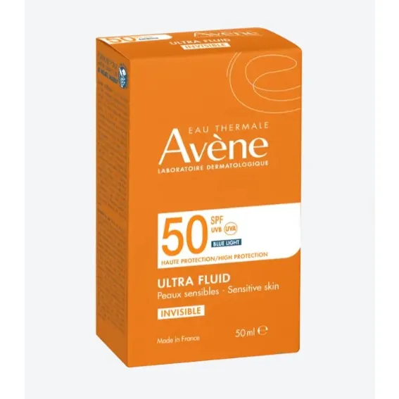Ultra Fluid Invisible SPF50 d’Avène offre une haute protection quotidienne contre les UVB, les UVA et la lumière bleue HEV, prévenant ainsi le photovieillissement.